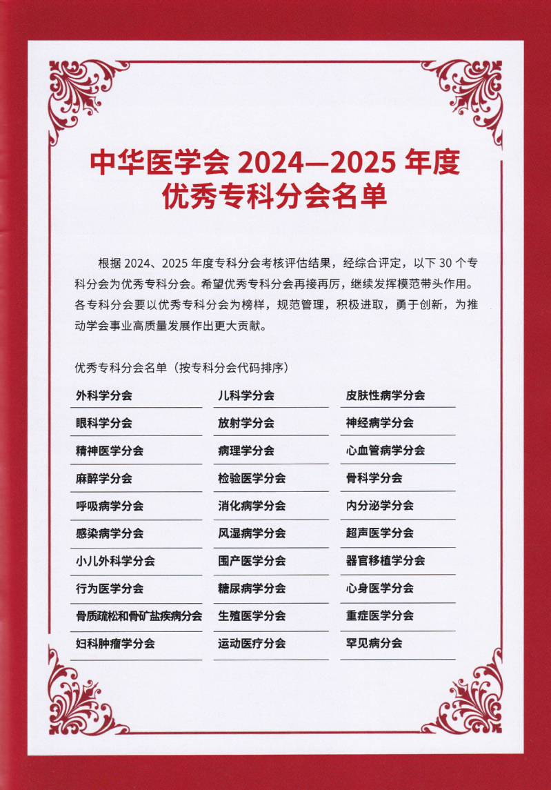 在中华医学会成立110周年之际,中华医学会行为医学分会凭借在学科建设、基层服务、学术创新及健康科普等领域的突出贡献,荣获2024-2025年度“优秀专科分会”称号,全国仅有30个分会入选。这一殊荣不仅是对分会36年发展历程的肯定,更是对其践行“行为决定健康”理念、推动健康中国战略落地的认可。