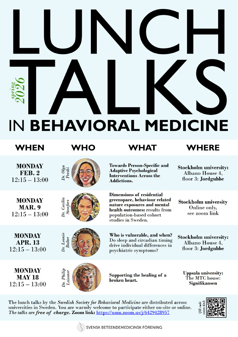 国际行为医学会联合瑞典行为医学会将于2026年春天举办一系列讲座/研讨会,会议将完全通过zoom进行,或者以包含zoom的混合形式进行。欢迎各位专家积极参与,详情如下。